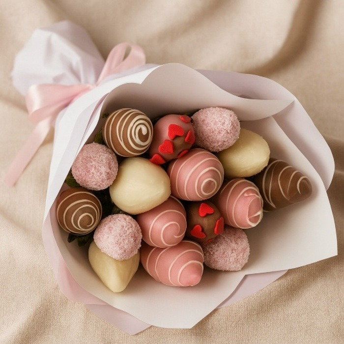 "Лиловое искушение” – это воплощение нежности и утонченности, где каждая ягода клубники, покрытая бархатным молочным, сияющим белым и романтичным розовым шоколадом, словно драгоценный камень. Облач...