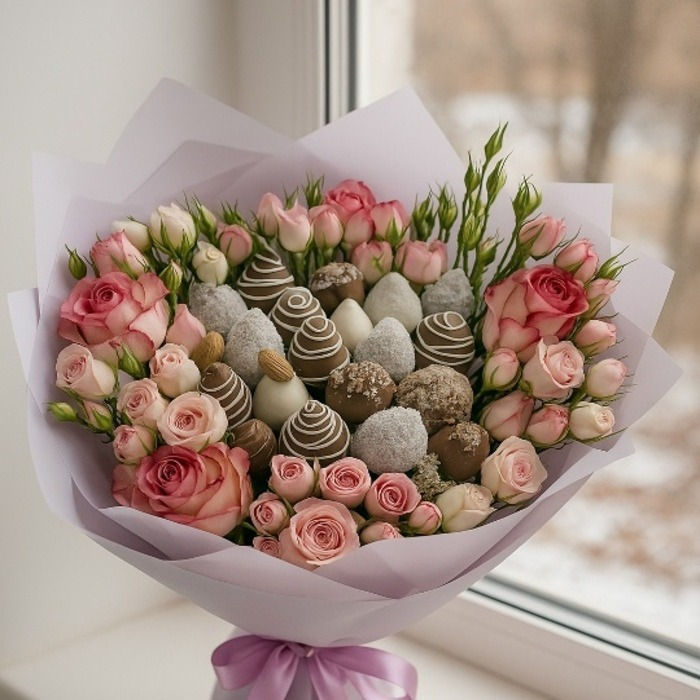 Сиреневый туман – гармоничное сочетание, которое пробуждает романтические чувства. Сочная клубника в шоколаде, нежные розовые розы и мягкий сиреневый оттенок упаковки создают неповторимую палитру ч...