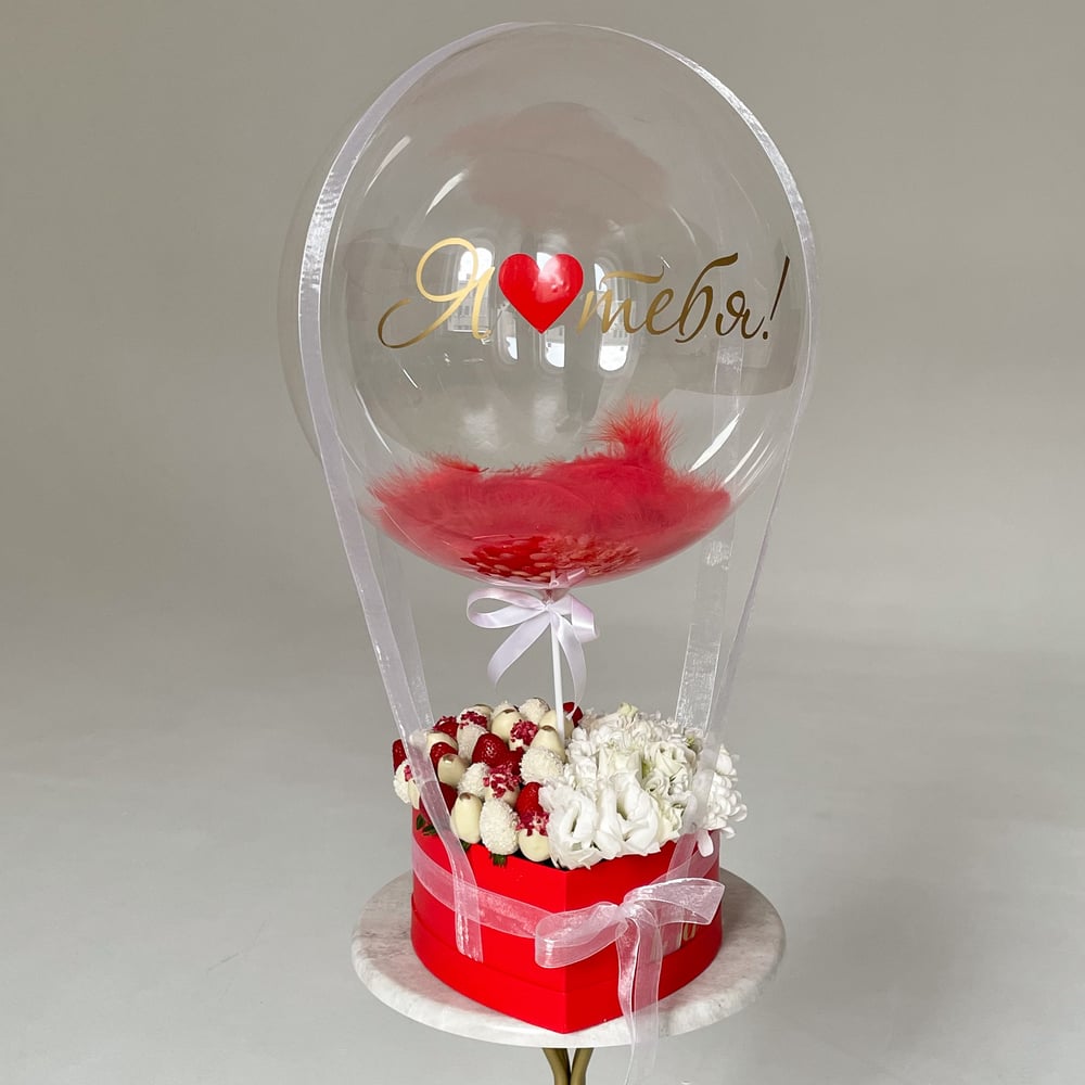 Состав: — 700 грамм свежей клубники в шоколаде — Микс цветов белая эустома и белая кустовая хризантема — Шоколад: белый — Декор: кокосовая стружка, сублимированная малина, золотой кандурин — Воздушный шар с перьями и надписью — Коробка в форме сердца Примечание: — Вы можете заказать индивидуальную надпись на воздушном боксе, что сделает ваш подарок оригинальным. — Композиции составляются из клубники по весу, а не по количеству, так как ягода может быть разного сорта, количество ягод может отличаться. — Бокс бережно упакован в прозрачную пленку для защиты от внешних факторов. — Натуральный продукт. Срок годности клубники в шоколаде до 24 часов. Храните ягоду в холодильнике при температуре +4..+8 градусов.