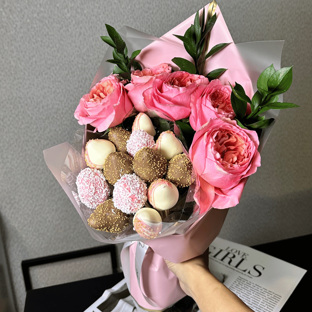 Букет из клубники в шоколаде с розами