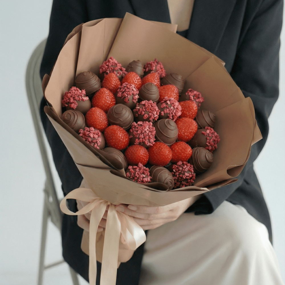 Состав: — 700 грамм свежей клубники в шоколаде — шоколад : молочный — декор : шоколадные полоски, кусочки сублимированной малины шоколад: молочный декор: шоколадные полоски, кусочки сублимирова…
