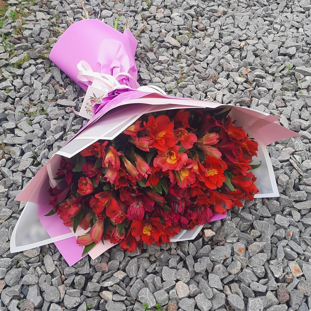 Букет красных альстромерий в дизайнерской упаковке. Цвет альстромерий можно изменить.