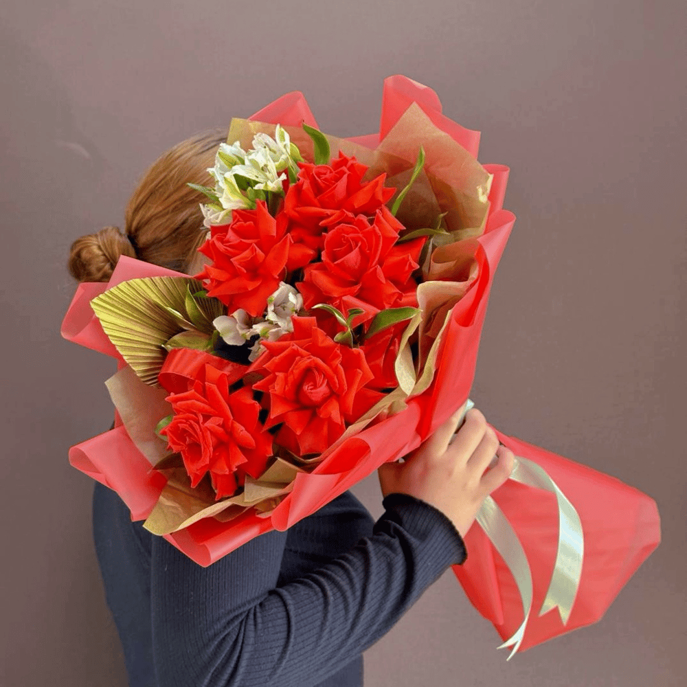 Букет из алых ажурных роз и белой альстромерии в корейской матовой пленке на День рождения маме, любимой жене на годовщину, учителю на выпускной, коллеге на годовщину. Ажурные ( французские розы) ...