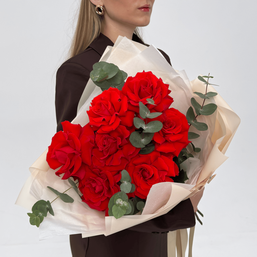 Современный и стильный букет из 7 ярких французских красных роз, дополненных свежими ветками эвкалипта. Гармоничное сочетание насыщенных цветов и нежной зелени создает элегантный и выразительный образ. Идеальный подарок для выразительных признаний, романтических моментов или украшения интерьера, наполняя пространство теплом и страстью.