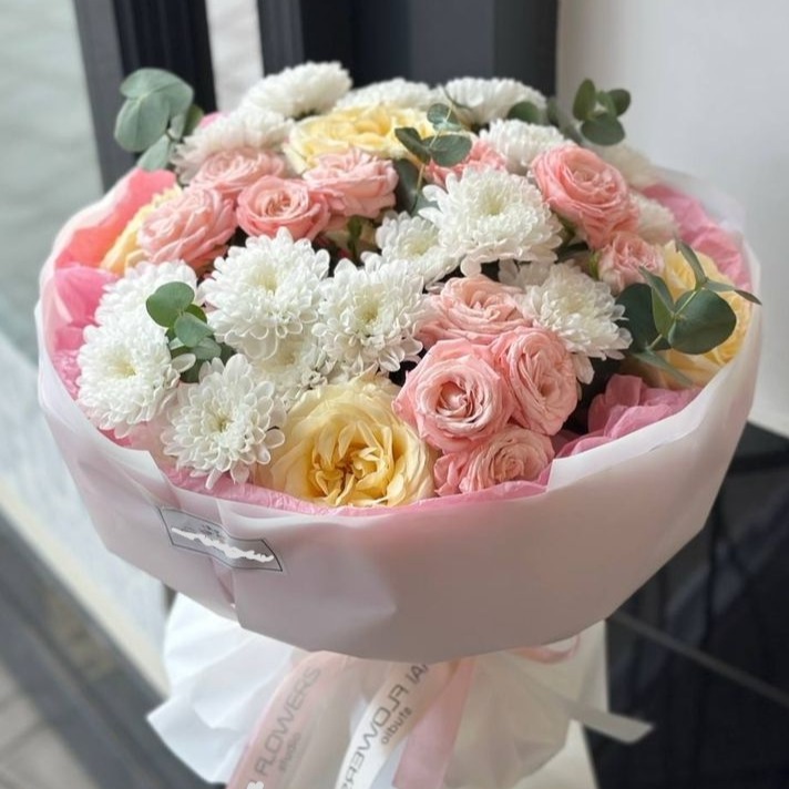Стильный букет из пионовидной кустовой розы, розы сорта канделайт и белой кустовой хризантемы, с добавлением веточек эвкалипта. Букет оформлен в дизайнерскую плёнку.