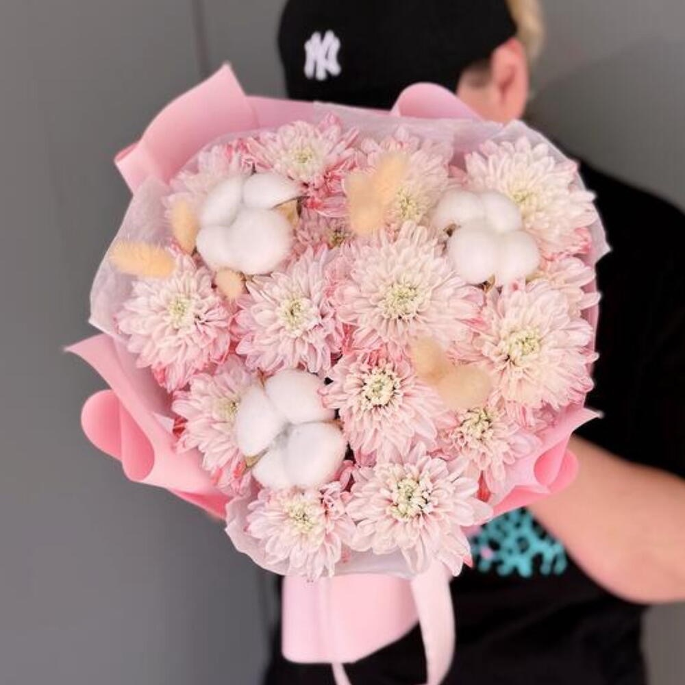 Классный комплимент из ароматной кружевной хризантемы, хлопка и натуральных пушистиков ларгуса в нежном воздушном оформлении 🤍🔝 💕