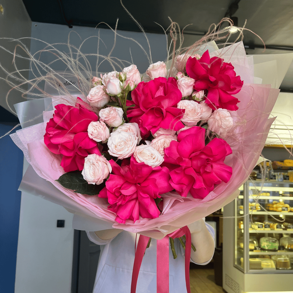 Роза кустовая - 4 шт. Роза французская - 5 шт. Оформление - 3 шт. Стифа - 3 шт. стаффаж - 3 шт.