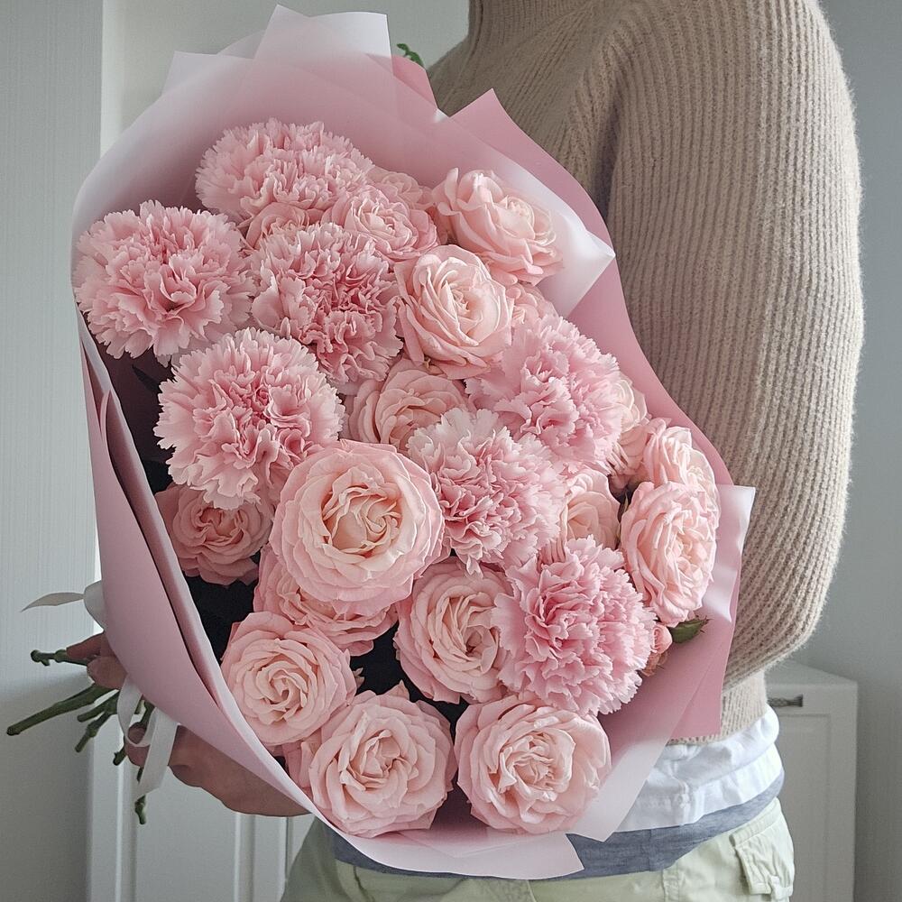 Нежный букет из кустовых пионовидных роз сорта Мадам Бомбастик и гвоздик в праздничной упаковке.