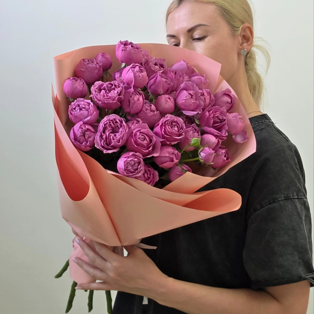 Букет из кустовых пионовидных роз в стильном оформлени порадует получателя своей роскошностью, стилем и изысканностью. Всё букеты мы доставляем на аквапакете и прикладываем подкормку для срезанных цветов, чтобы ваши близкие радовались подарку как можно дольше.