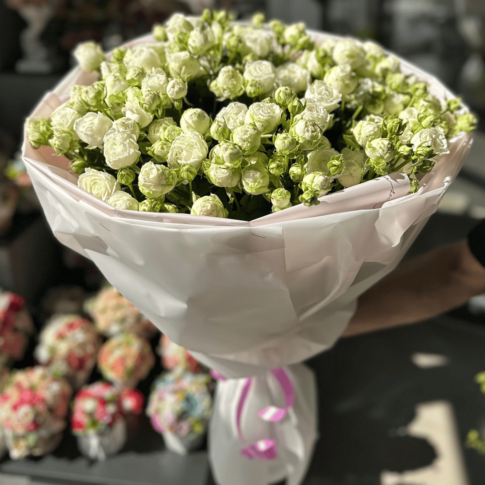 Букет из кустовых роз в двойной бумаге Первый слой - розовая Второй - белая