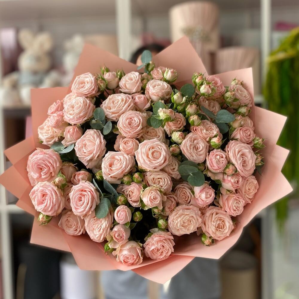 Букет из нежно розовых пионовидных роз с ароматным эвкалиптом . Этот букет станет прекрасным подарком для мамы, бабушки, коллеги, любимой или делового партнера. Он будет радовать глаз и приносить р...