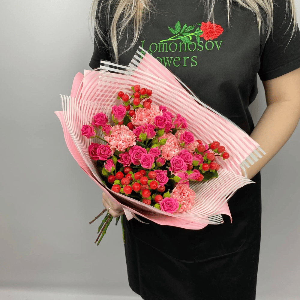 Авторский букет из хризантем, кустовых роз и красных ягод гиперикума в фирменной упаковке. 🎁 В подарок к букету Вы получите: - фирменную открытку с Вашими пожеланиями - инструкцию по уходу за букетом - подкормку для срезанных цветов