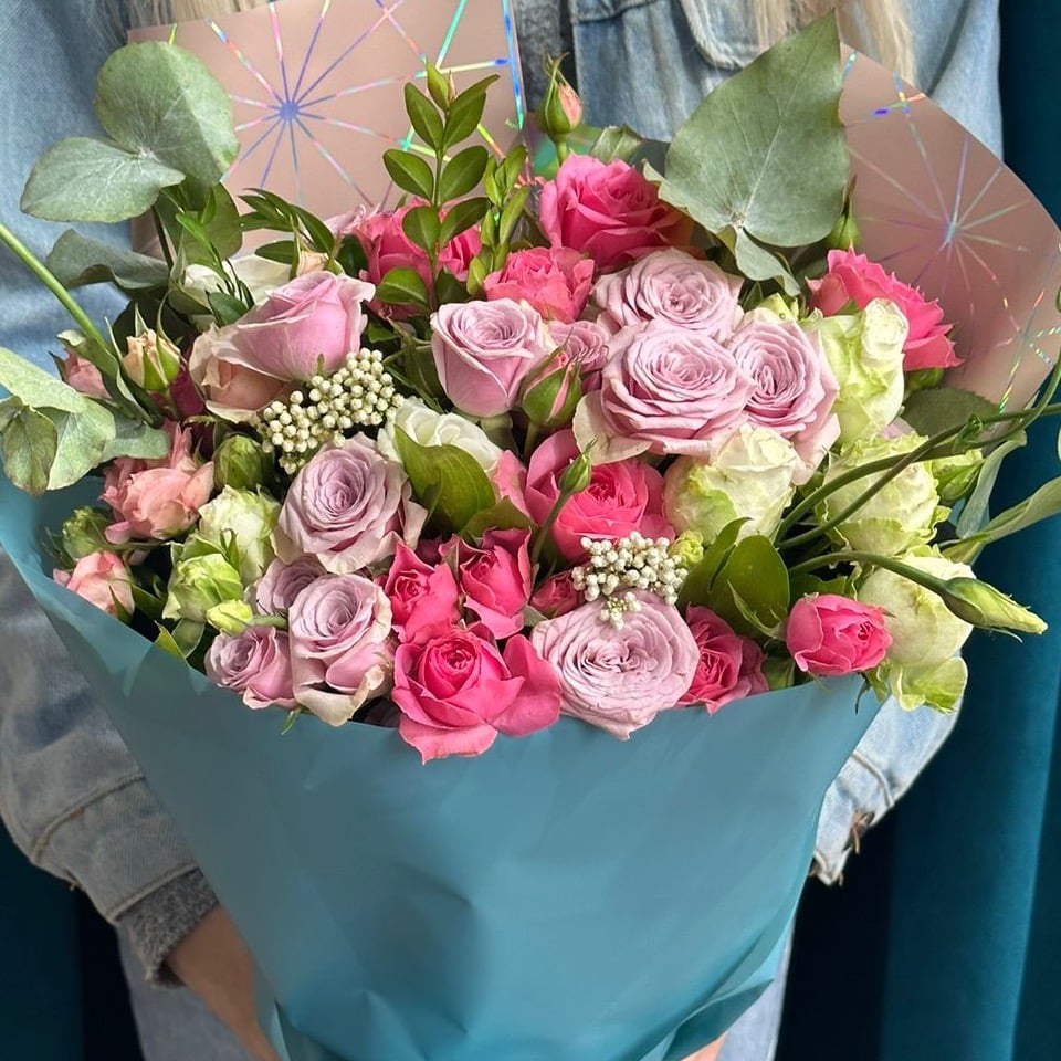Букет из кустовых роз и эвкалипта