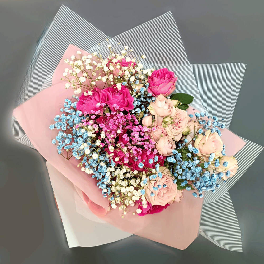 Букет из кустовых роз и гипсофил