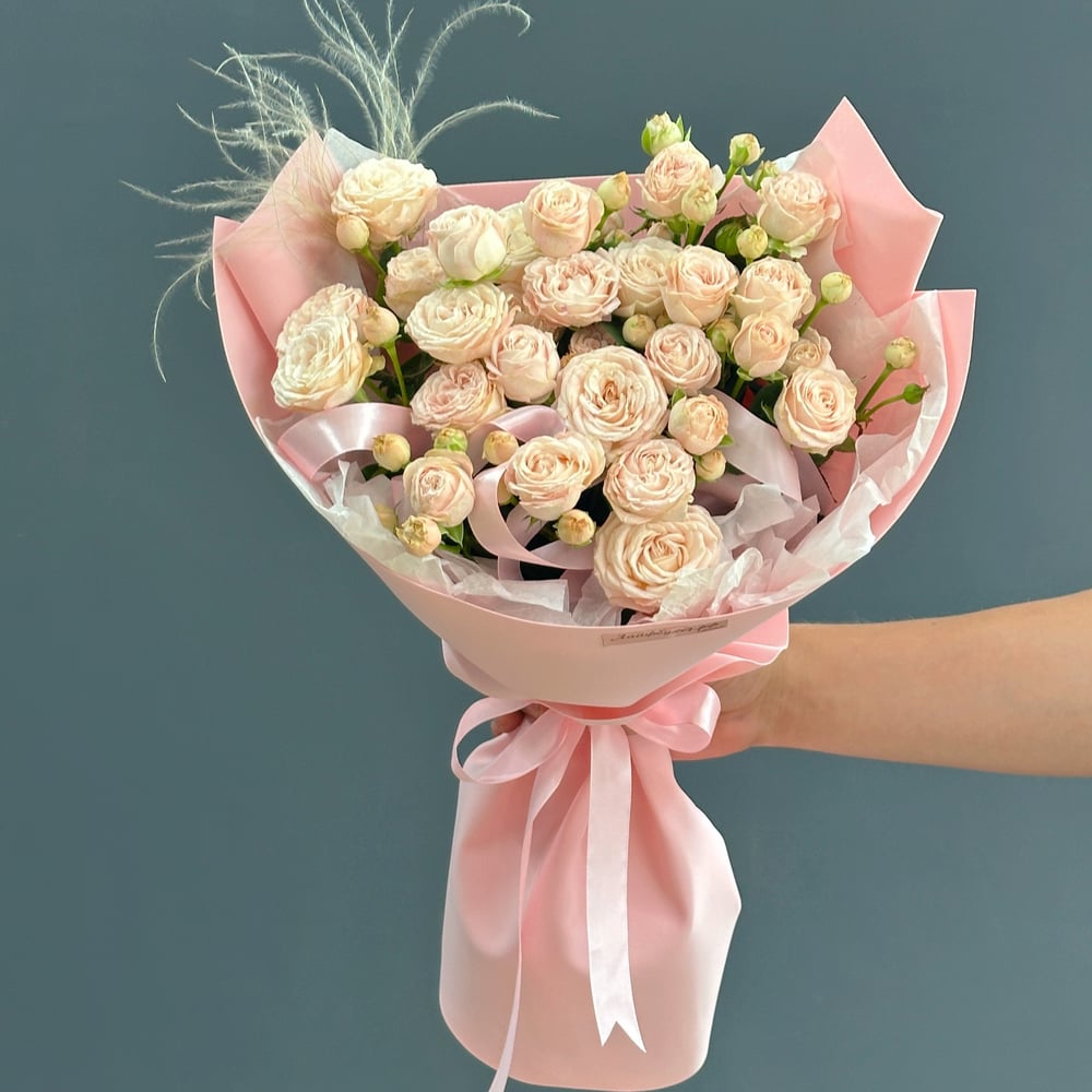 Этот букет создаёт ощущение свежести и нежности первых лучей солнца. Кустовые розы в мягких, пастельных тонах символизируют новое начало, чистоту и лёгкость настроения. Каждый цветок словно наполне...