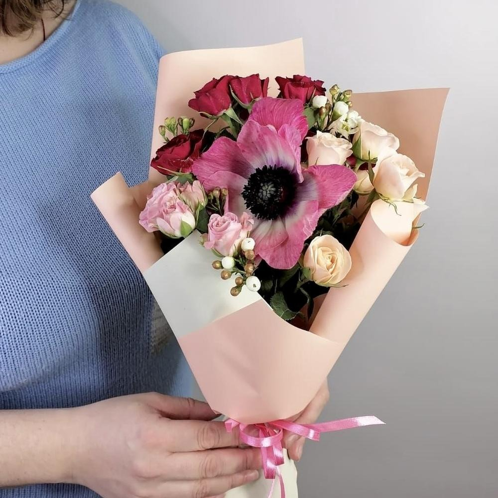 Букет из Кустовых Роз, Ваксфлауэра и Анемона