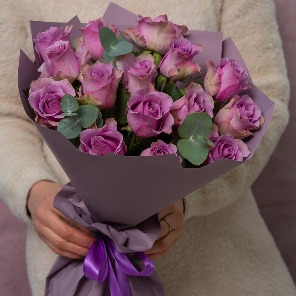 Букет из 15 лавандовых роз с добавлением эвкалипта.