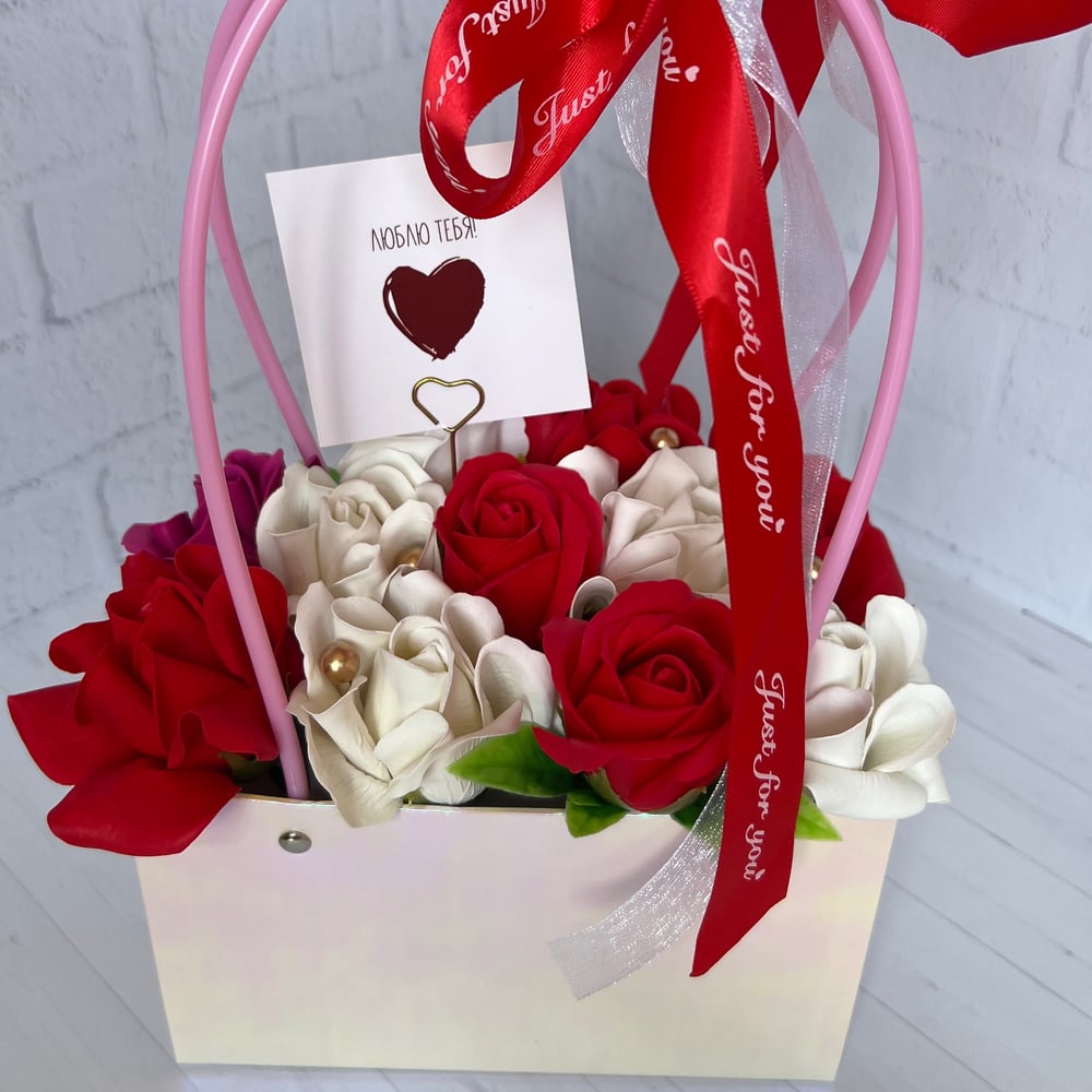 Эта перламутровая сумочка с мыльными розами - идеальный подарок для тех, кого вы хотите порадовать и удивить. Букет из 11 мыльных роз «микс» с французскими розами состоящих из белых, красных и р...