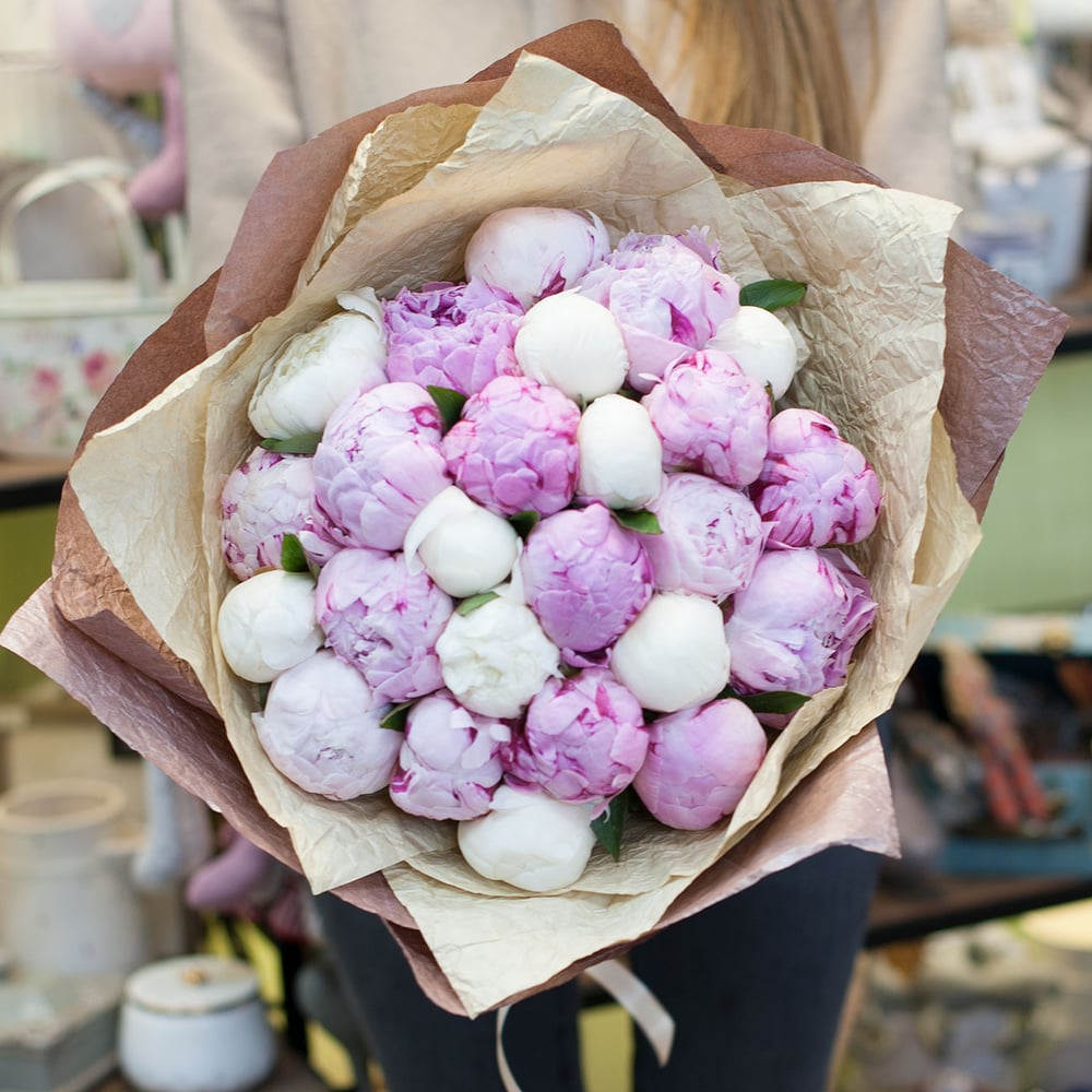 Букет из розовых и белых пионов в дизайнеркой бумаге крафт.