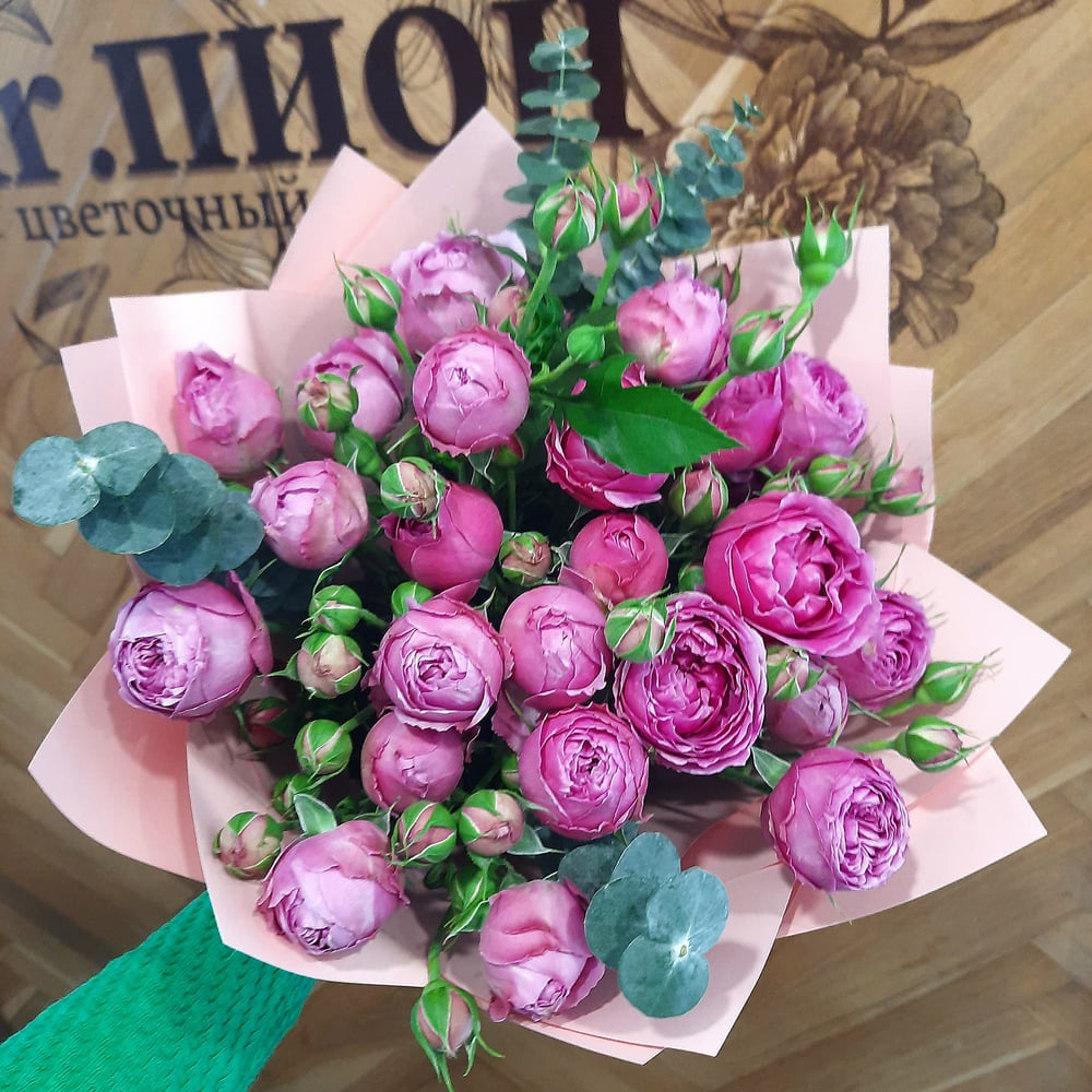 Нежный букет из 5 кустовых пионовидных роз сорта Мисти Баблз