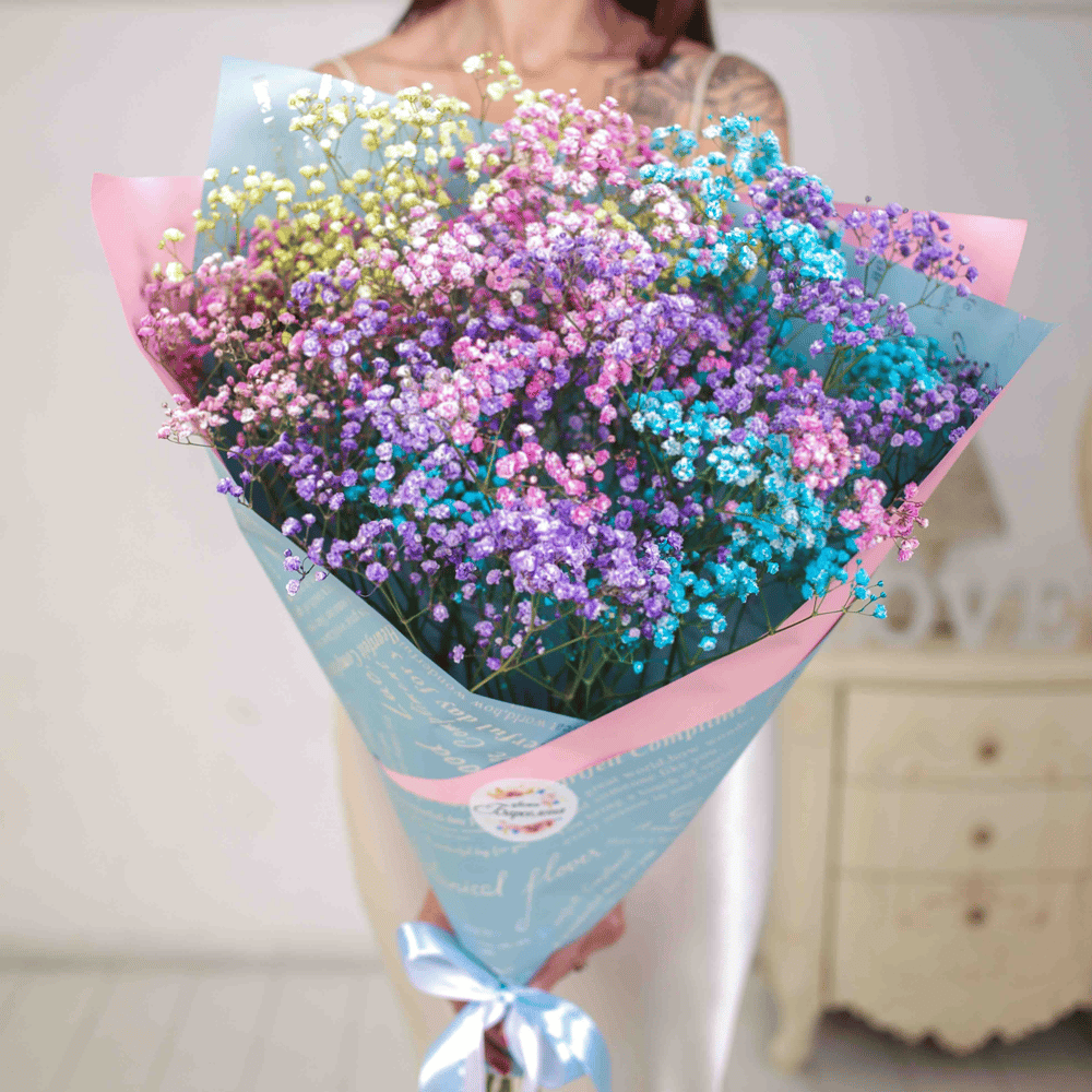 Букет из 11 пышных веточек украсит любое событие. За счет чего получается такой яркий цвет? Ответ очень простой: Мы не красим цветы баллончиком с краской. По специальной технологии через корневую систему, промышленным образом выкрашивается белая гипсофила. Не имеет запаха и абсолютно безопасна для аллергиков. Каждое соцветие имеет большое количество веточек.