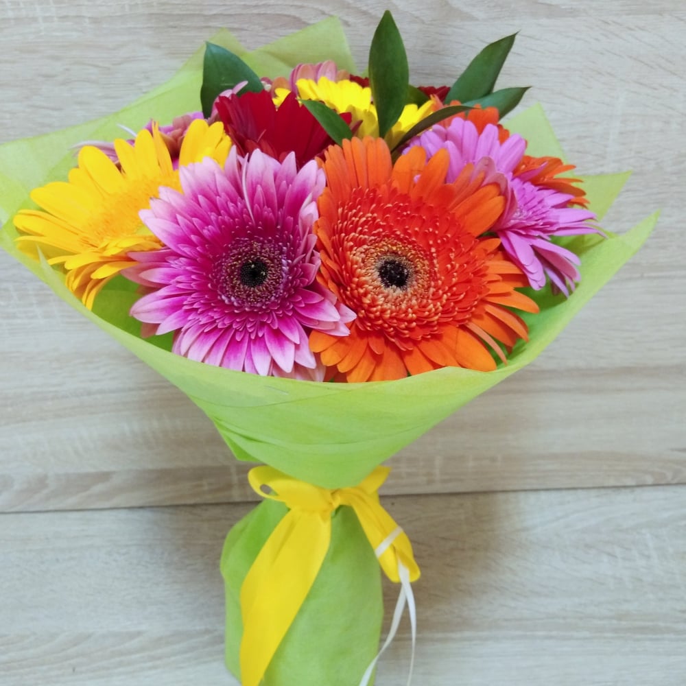 Яркий и солнечный букет из гербер с добавлением сочной зелени рускуса и оформлением фетром и атласной лентой
