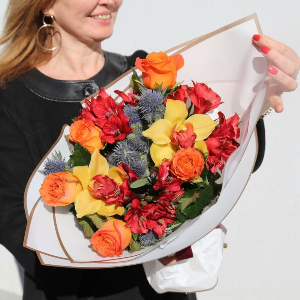 Оригинальная цветочная композиция, созданная из бутонов альстрометрий, роз и орхидей станет актуальным подарком по любому поводу.