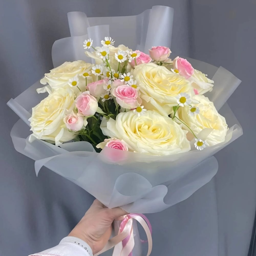 Искренний знак внимания - букет АНЖЕЛИКА из невинно-белых роз Канделайт, приправленный нежного оттенка кустовых роз и игривой матрикарии. Белоснежные королевские цветы дарят незабываемое ощущение нежности и чистоты, позволяя без слов высказать адресату подарка все самые возвышенные чувства, которые испытывает даритель. ⠀ Состав: роза Канделайт - 7 шт., кустовая роза - 2 шт., матрикария - 3 шт., упаковка, ленты