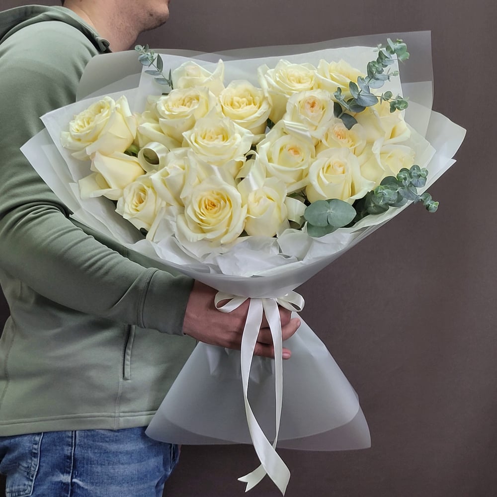 Этот изысканный букет включает в себя нежные белые розы, которые символизируют чистоту и нежность. Дополнительно использованы веточки эвкалипта, чтобы добавить букету свежести и аромата. Букет упакован в элегантный дизайн с использованием тишью, матовой пленки и атласной ленты, что делает его прекрасным подарком для особого человека.