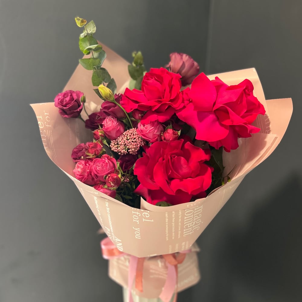 Изысканный букет, созданный, чтобы дарить эмоции 💞 В его сердце — три роскошные эквадорские розы глубокого красного оттенка, обрамлённые нежной кустовой розой и воздушной эустомой. Тёплая персиковая упаковка подчёркивает утончённость и делает букет особенно женственным. 💋 Идеален для признания в любви, дня рождения или просто, чтобы сказать — ты самая прекрасная. 🌹 Состав: — Эквадорская роза — Кустовая роза — Эустома — Декоративная зелень — Персиковая упаковка 📸 Фото букета — перед доставкой, чтобы вы убедились, что всё идеально. 🚗 Быстрая доставка по городу. 💌 Можно добавить открытку с вашим пожеланием.