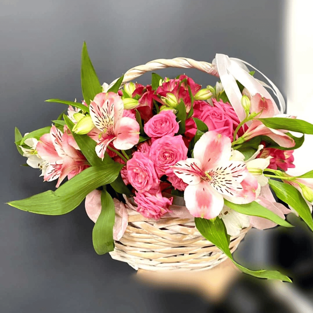 Этот прекрасный букет в корзине состоит из нежных кустовых роз и ярких альстромерий. Он отличается свежестью и яркими красками, которые добавят радости и тепла в любой дом. Каждый цветок в этом бук...
