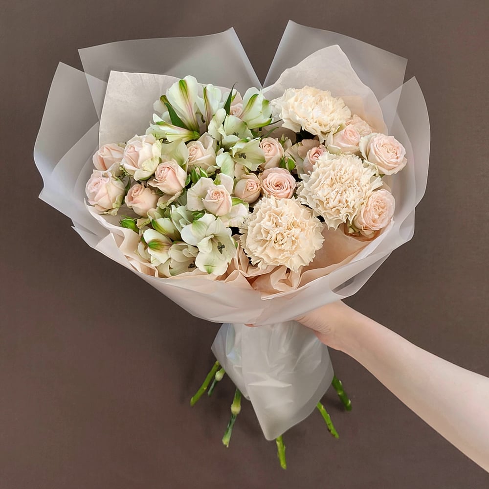 Прекрасный букет, состоящий из нежных кустовых роз, ярких альстромерий и нежных диантусов. Упакован в стильную матовую пленку, украшенную атласной лентой. Этот букет станет прекрасным подарком для любого случая и порадует своим красивым и изысканным видом.