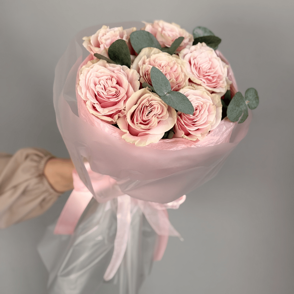 В состав букета входит : - Роза розовая - 7 шт - Эвкалипт - Букет бережно упакован в современную корейскую упаковку и перевязан атласной лентой❤️ — Дизайнерская упаковка с атласной лентой 🎀 —Каждый цветок уникален, поэтому повторить букет 1в1 невозможно. Мы соблюдаем соответствие общего количества цветов, цветовой гаммы и объема букета. — Цветы установлены на акваножке — специальной упаковке с водой для поддержания свежести — В каждый букет добавляется инструкция по уходу за цветами и кризал — подкормка для срезанных растений — Букет бережно упакован в крафт, который защищает от внешних факторов