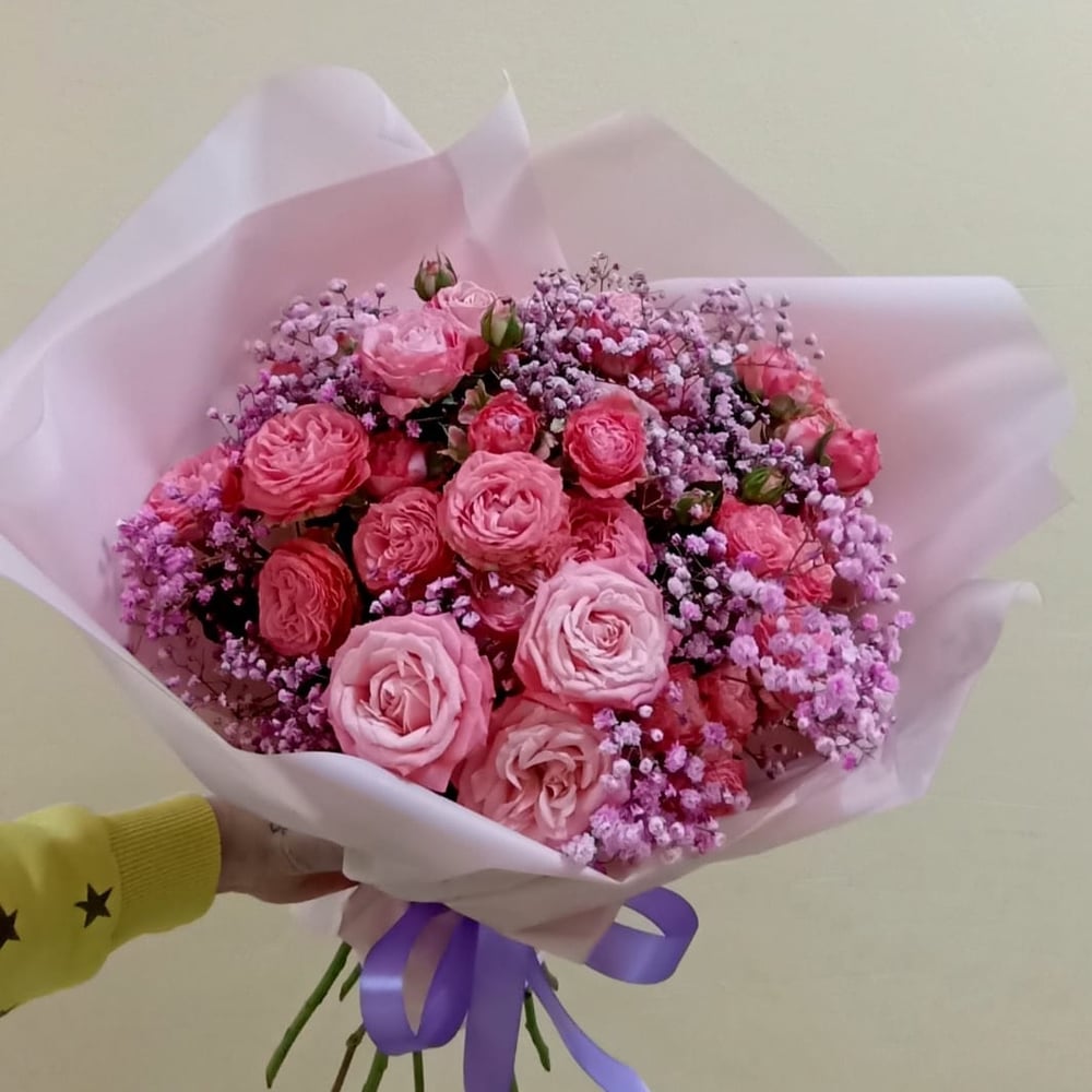 Букет, состоящий из роз кустовых и гипсофилы, представляет собой нежное сочетание цветов и текстур. Розы кустовые считаются одними из самых изящных и элегантных сортов роз, благодаря своим компактным кустикам и крупным цветкам. Гипсофила добавляет легкости и воздушности композиции своими мелкими цветками и ветвистыми стеблями. Букет упакован в стильную упаковку, которая подчеркивает его изысканность и готовность к подарку. Он отлично подойдет для любого торжественного случая или просто для порадовать близкого человека в любой день.
