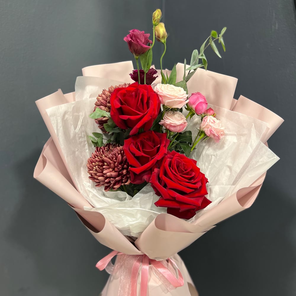 Нежный и гармоничный букет из 3 красных одноголовых роз (Эквадор), дополненный розовыми кустовыми розами, воздушной эустомой и утончённой хризантемой. Это сочетание страсти и нежности, где каждая деталь подчёркивает чувство и заботу. Идеальный вариант для подарка любимой, подруги, мамы или коллеги — на день рождения, свидание или просто без повода. Букет оформлен в стильную упаковку, которая делает его элегантным и современным подарком, готовым к вручению.