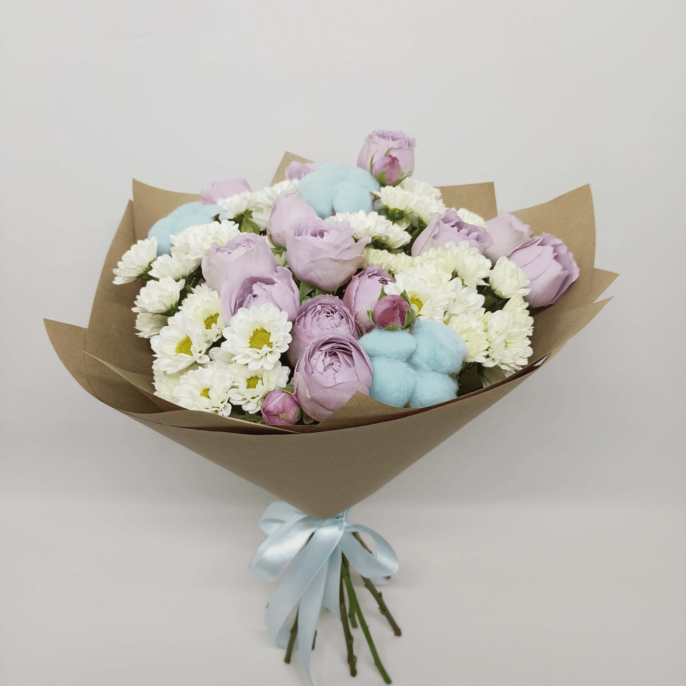 Элегантный, красочный букет из хризантем Сантини и нежной кустовой розы. Натуральный хлопок и упаковка из крафт-бумаги подчеркивают природную красоту цветов и создают атмосферу уюта. Идеальный подаро…