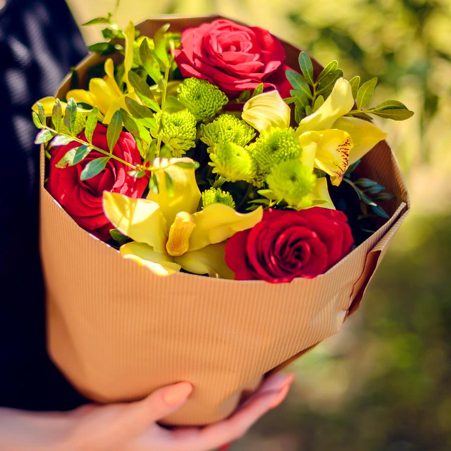 Яркий летний букет из роз, орхидей, хризантемы и фисташки! Такой букет подойдёт для любого повода: день рождения, именины, годовщина свадьбы, рождение ребенка, 8 марта, день Святого Валентина, вып...
