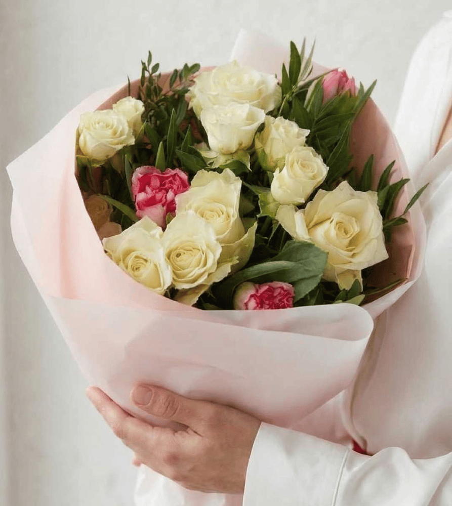 Букет из роз и пионовидных тюльпанов "Легкий ветерок"
