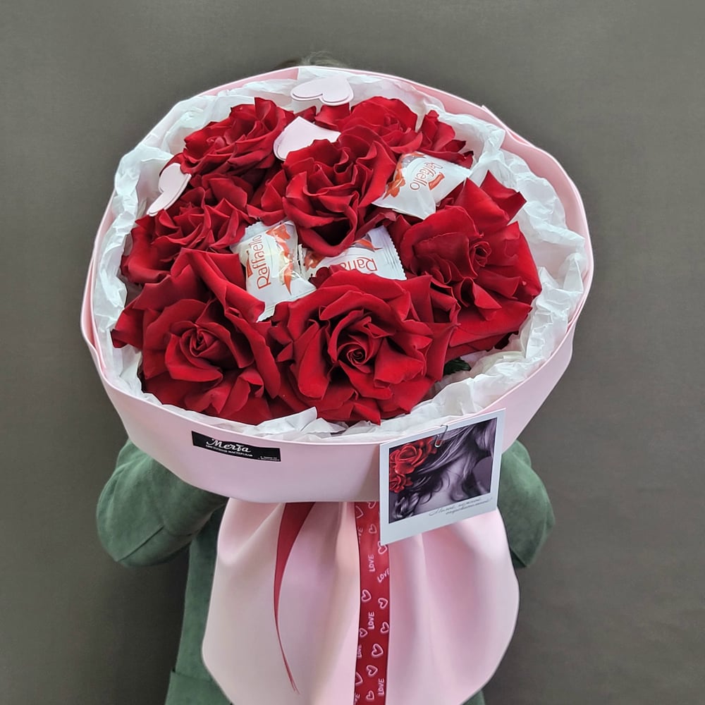 Букет из роз и рафаэло "Вкусное кружево"