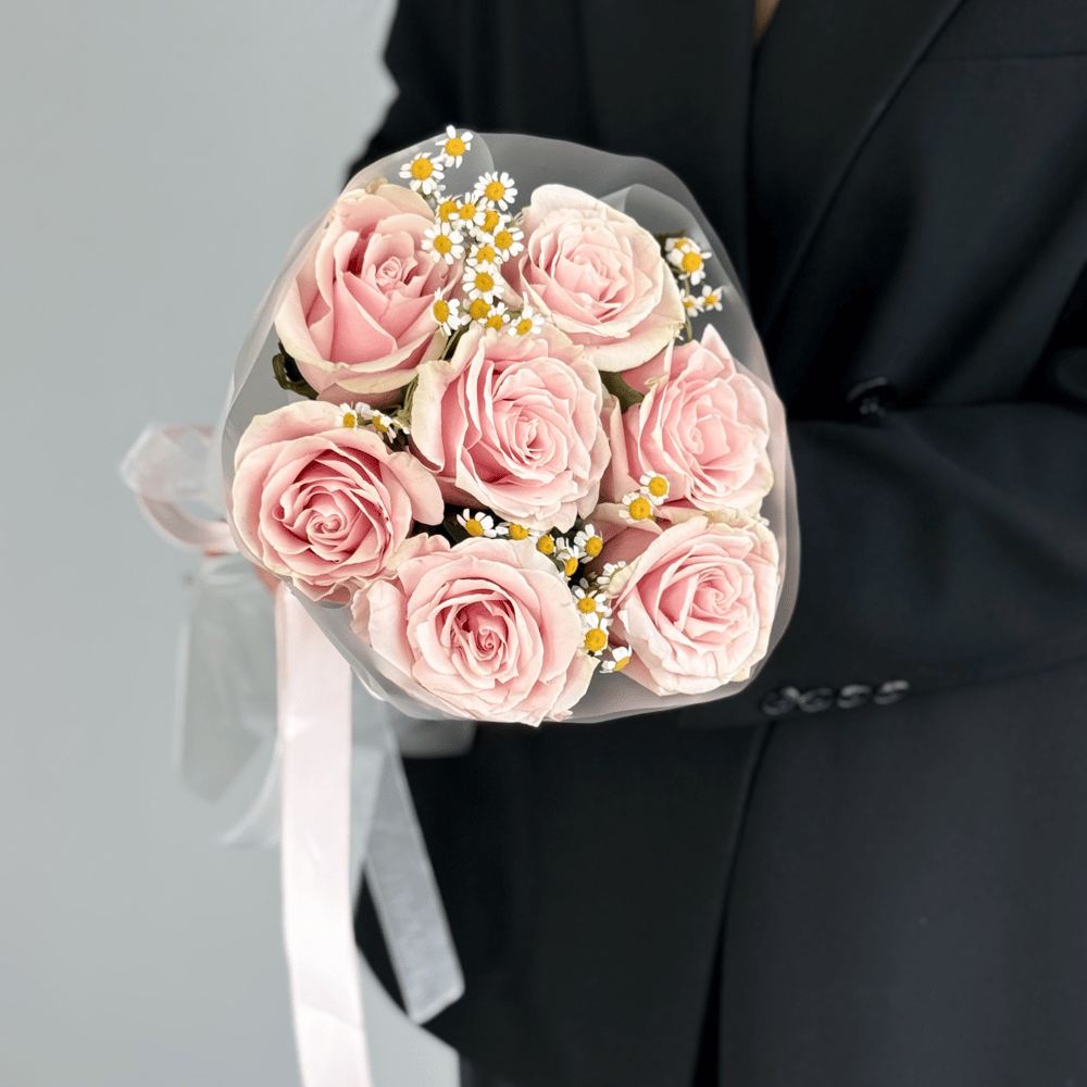 В состав букета входит : - ромашка кустовая - 2 шт - Роза розовая - 7 шт - Букет бережно упакован в современную корейскую упаковку и перевязан атласной лентой❤️ — Дизайнерская упаковка с атласной лентой 🎀 —Каждый цветок уникален, поэтому повторить букет 1в1 невозможно. Мы соблюдаем соответствие общего количества цветов, цветовой гаммы и объема букета. — Цветы установлены на акваножке — специальной упаковке с водой для поддержания свежести — В каждый букет добавляется инструкция по уходу за цветами и кризал — подкормка для срезанных растений — Букет бережно упакован в крафт, который защищает от внешних факторов