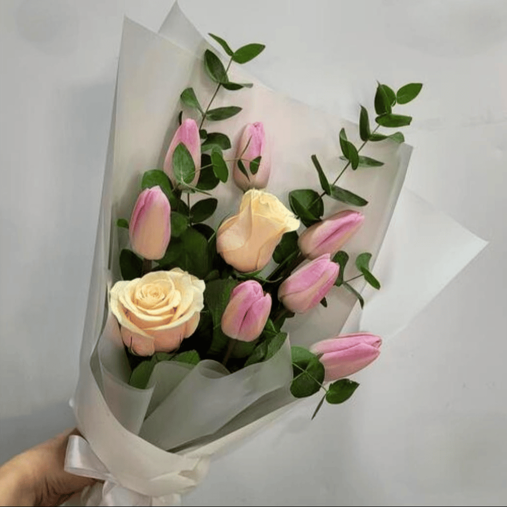 Этот нежный и изысканный букет состоит из ярких тюльпанов, нежных роз и зеленой пистации. Он упакован в стильную упаковку, что делает его отличным подарком для любого повода. Букет создан для того,...