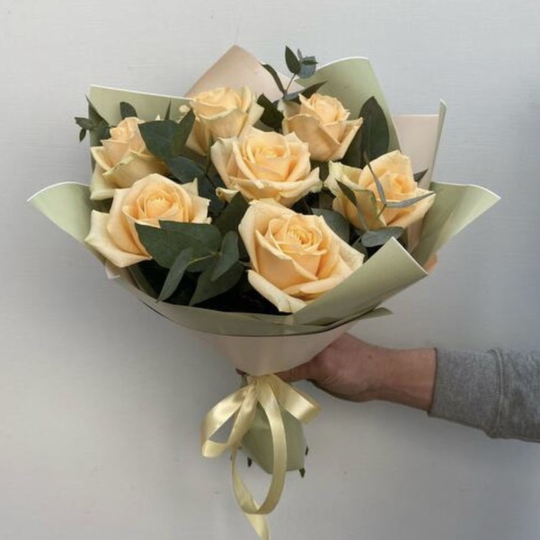 Букет в упаковке с ключевым акцентом на 9 прекрасных роз. Розы - символ любви и нежности, каждая из них сияет своим собственным уникальным обаянием. Ветви эвкалипта подчёркивает красоту роз и добавля…
