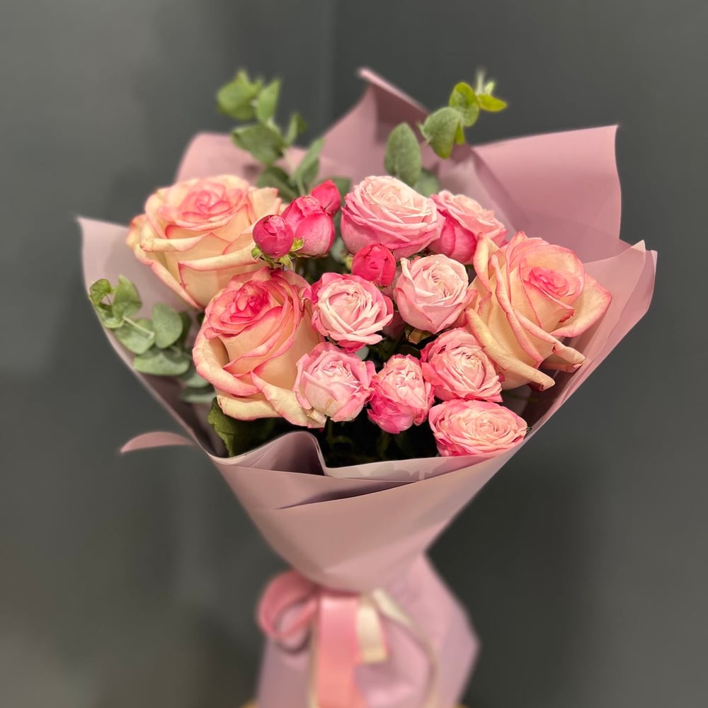 Красивый букет из роз в розовой упаковке — символ нежности и любви. Кустовые и эквадорские розы раскрываются крупными бутонами, а свежий эвкалипт добавляет композиции стиль и лёгкость. Такой букет станет отличным подарком на день рождения, 8 марта или просто для поднятия настроения.