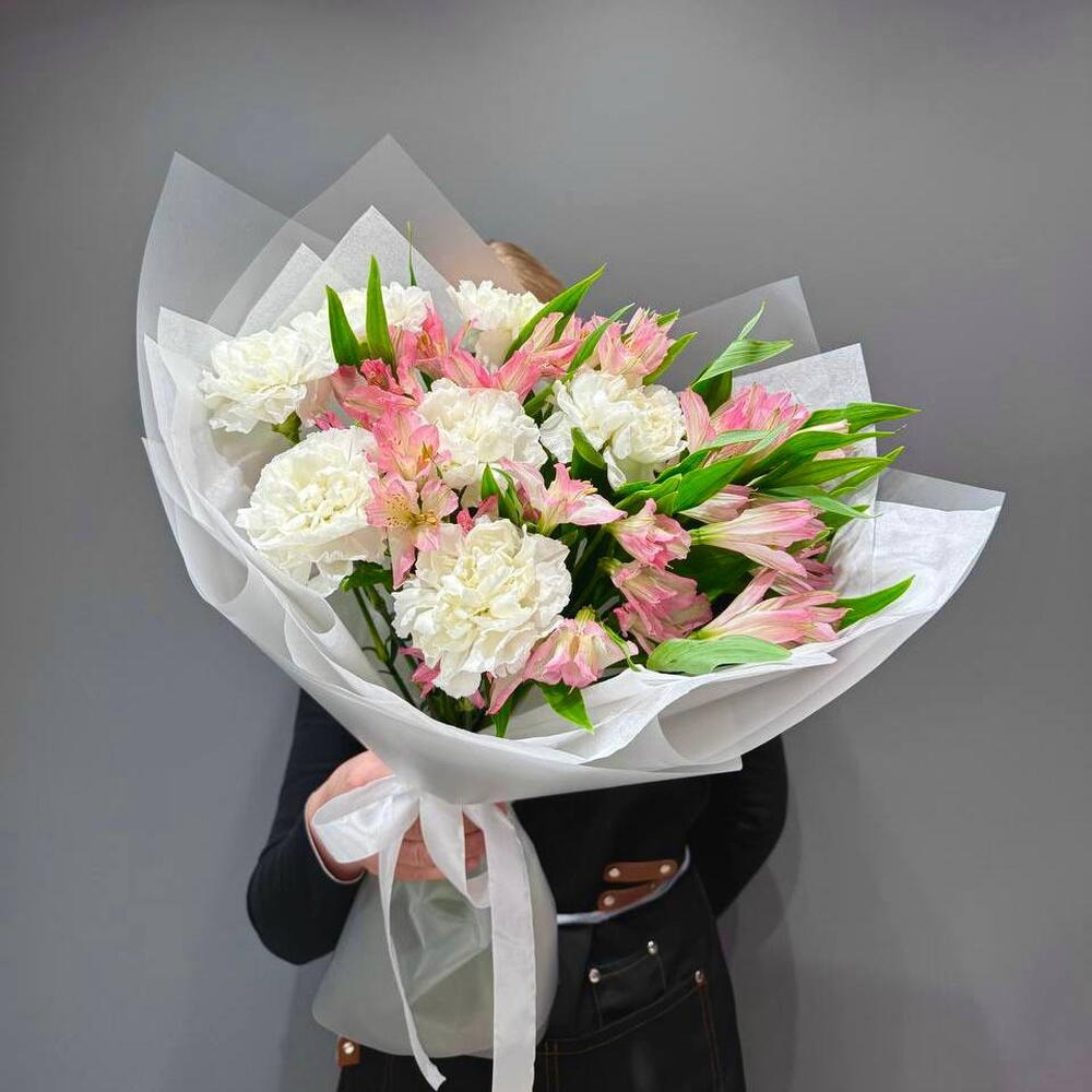 Состав: Альстромерия - 6 шт. Гвоздика - 7 шт. Лента атласная - 1 шт. Тишью - 2 шт. Пленка матовая - 2 шт. Размер: Ширина - 35 см Высота - 45 см