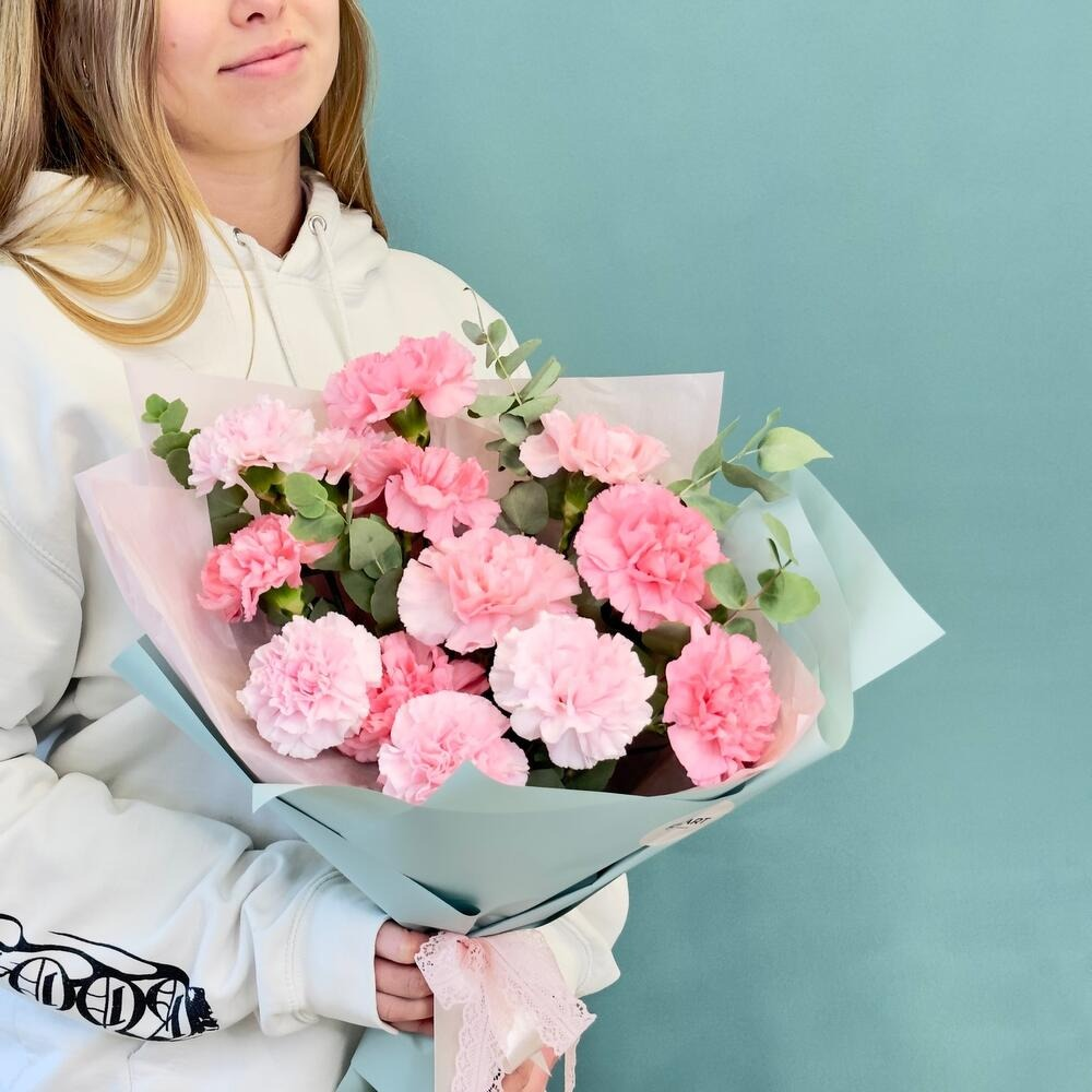 Букет из розовых диантусов с эвкалиптом из гвоздик