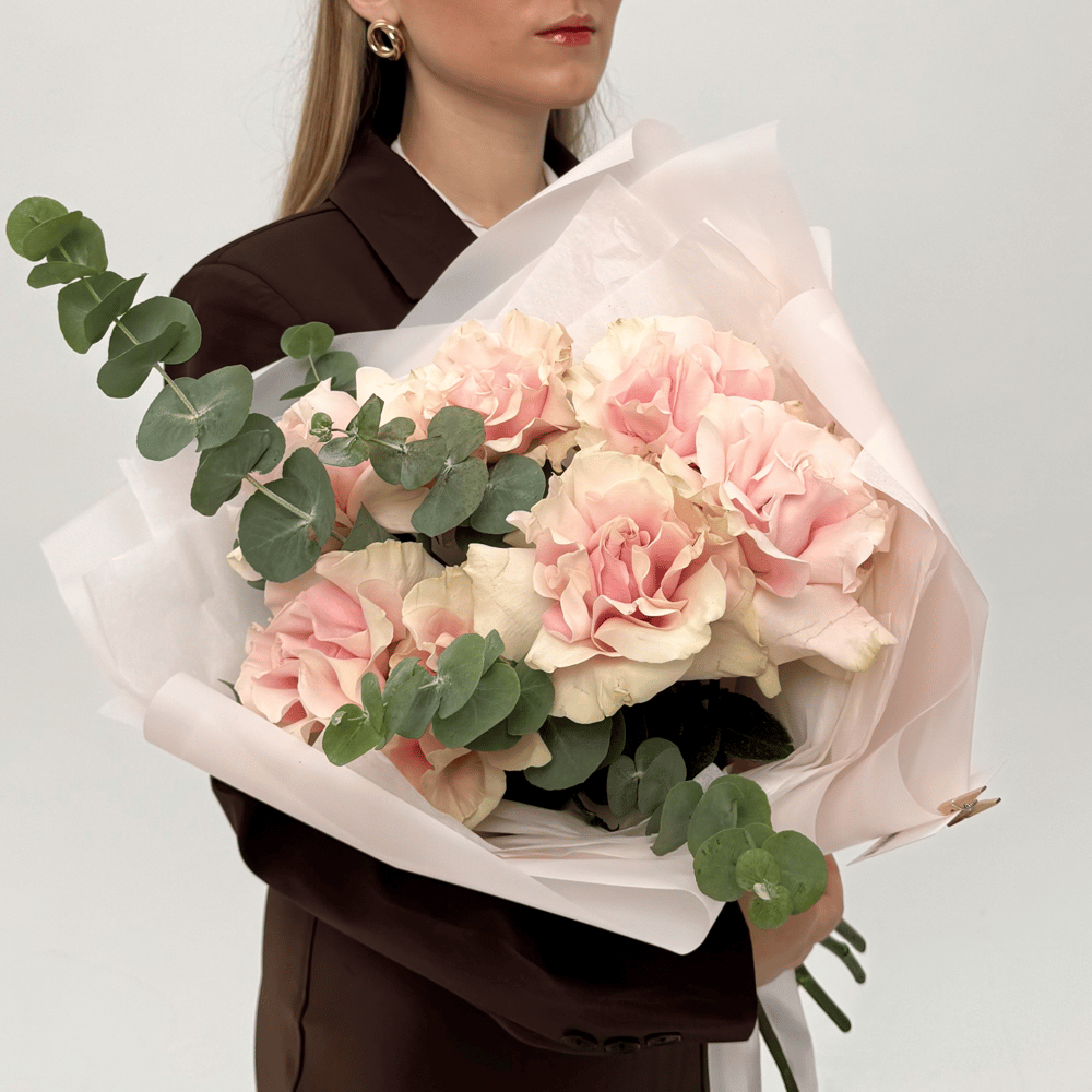 Нежный букет из 7 розовых французских роз, дополненных свежими ветками эвкалипта. Утончённое сочетание мягких пастельных оттенков и воздушной зелени создаёт романтичную и легкую атмосферу. Идеальный подарок, чтобы выразить заботу, нежность и искренние чувства, добавляя тепла и гармонии в любой момент.