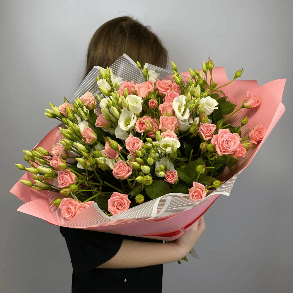Пышный букет из розовых кустовых роз и белых эустом (лизиантусов). Букет выполнен в ярком оттенке розового цвета в авторской упаковке. Букет подойдет для любого повода и удивит получателя своей крас…