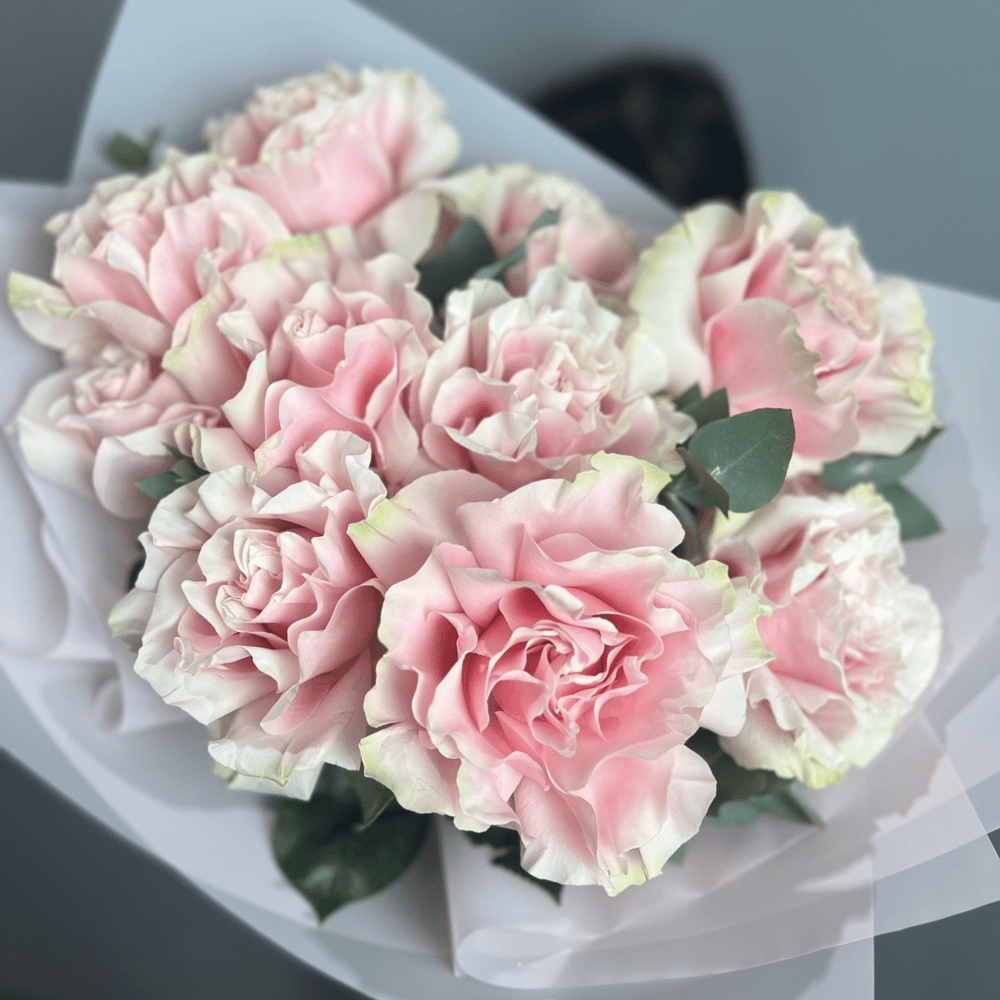 Нежные ароматные розы Пинк мондиал (вывернутые) в сочетании с эвкалиптом