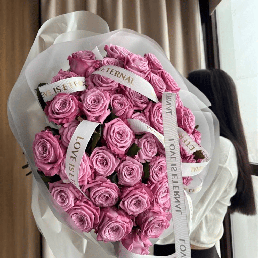 Букет из розовых роз с оформлением