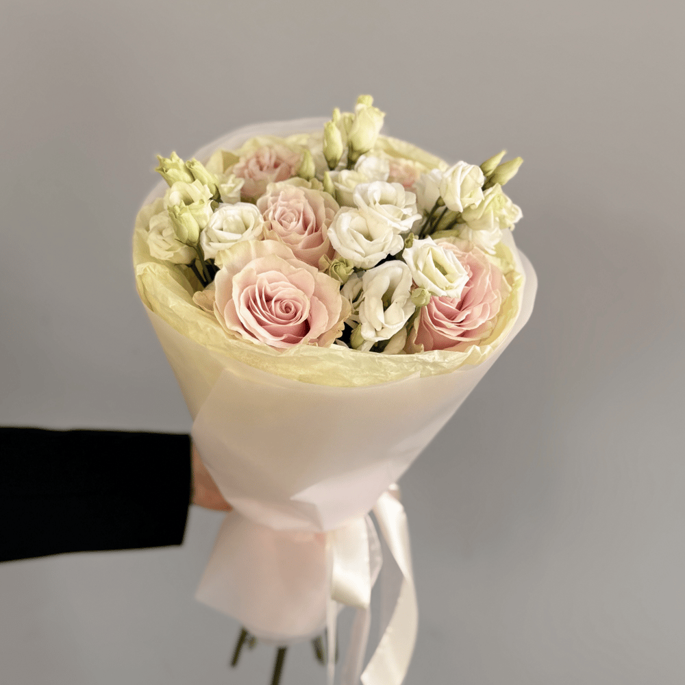 В состав букета входит : - эустома белая - 4 шт - роза розовая - 3 шт - Букет бережно упакован в современную корейскую упаковку и перевязан атласной лентой❤️ — Дизайнерская упаковка с атласной лентой 🎀 —Каждый цветок уникален, поэтому повторить букет 1в1 невозможно. Мы соблюдаем соответствие общего количества цветов, цветовой гаммы и объема букета. — Цветы установлены на акваножке — специальной упаковке с водой для поддержания свежести — В каждый букет добавляется инструкция по уходу за цветами и кризал — подкормка для срезанных растений — Букет бережно упакован в крафт, который защищает от внешних факторов